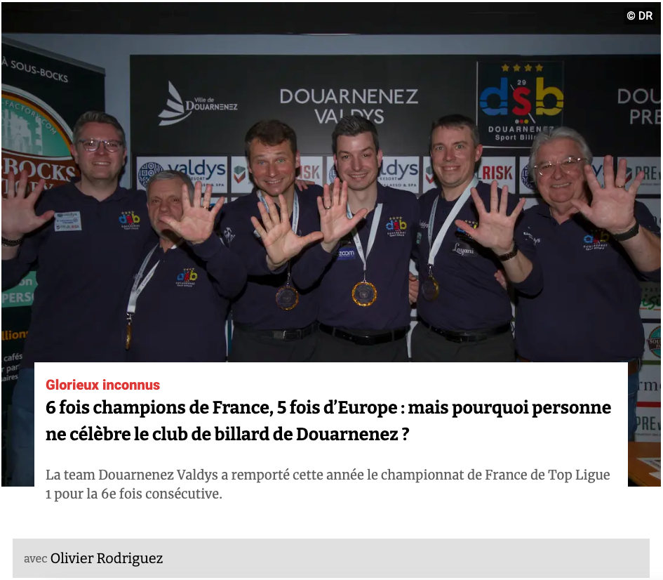 Dans cette époque absurde, être six fois de suite champion de France et cinq fois vainqueur de la coupe d'Europe n'est pas obligatoirement synonyme de gloire et de reconnaissance. La preuve, puisque les joueurs de la Team Douarnenez Valdys, c'est d'eux qu'il s'agit, sont menacés par l'anonymat, le plus inconfortable des oublis. Pour le dire autrement, le drame de ces sportifs d'élite réside dans le fait, paradoxal, que ce qu'ils font de plus remarquable, n'est malheureusement pas remarqué.