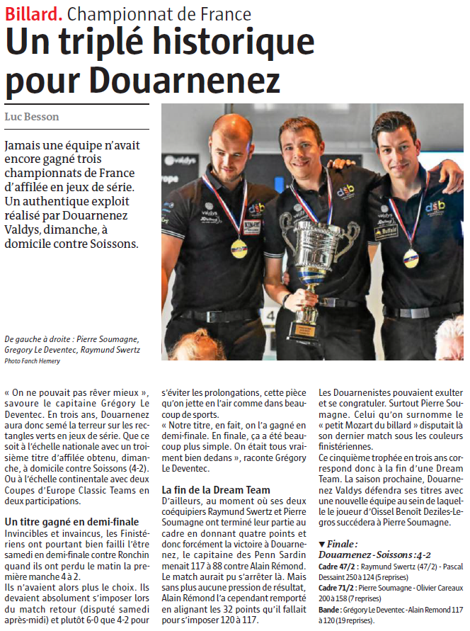 🏵️ 𝗥𝗲𝗰𝗼𝗿𝗱 𝗱𝗲 𝗙𝗿𝗮𝗻𝗰𝗲 𝗽𝗼𝘂𝗿 𝗗𝗼𝘂𝗮𝗿𝗻𝗲𝗻𝗲𝘇 𝗩𝗮𝗹𝗱𝘆𝘀 𝗲𝘁 𝘂𝗻 𝟱𝗲̀𝗺𝗲 𝘁𝗶𝘁𝗿𝗲 𝗻𝗮𝘁𝗶𝗼𝗻𝗮𝗹 𝗱𝗲 𝘀𝘂𝗶𝘁𝗲 𝗱𝗮𝗻𝘀 𝗹𝗲 𝘃𝗶𝘀𝗲𝘂𝗿 ! 🇨🇵 💪🏻 En remportant hier ses 2 rencontres, Douarnenez Valdys conserve son invincibilité cette saison avant le Final 4 qui aura lieu en juin à Douarnenez. 😮 Avec des séries exceptionnelles de 115 à la bande pour Greg Le Deventec (120 en 3 reprises), de 250 au Cadre 47/2 pour Raymund Swertz (250 en 1 reprise) et de 130 au Cadre 71/2 pour Louis Edelin (200 en 4 reprises) les douarnenistes frappent un très grand coup en battant le record de France de la moyenne d´équipe ! 🏆 Championnat de France Division 1 - Jeux de Série 🇨🇵️ ➡️ Final 4️⃣ - 📅 25-25 juin 🔵🔴🟡 ⭐️⭐️ ⭐️ ⭐️ #VibrerDSB #TeamDSB #DouarnenezValdys #JDSD1 #J4 #Final4 #SportBillard #Billard️ #DSB #FFB #ValdysResort #France #Bretagne #Finistère #Douarnenez ⚪️🔴⚪️Button