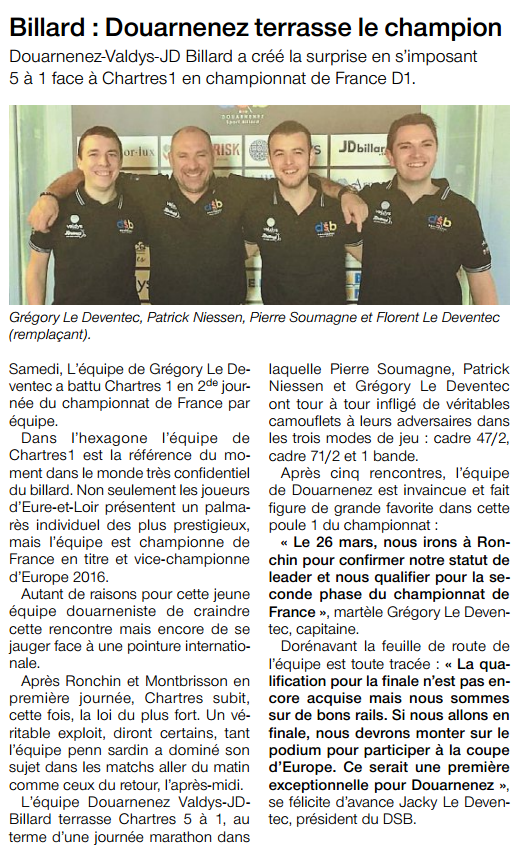 𝗙𝗶𝗻 𝗱𝗲 𝗺𝗮𝘁𝗰𝗵 🏆 Championnat de France Division 1 - Jeux de Série 🇨🇵️ ➡️ Journée 2️⃣ 🆚 Douarnenez Valdys 4️⃣ - 2️⃣ C'Chartres Billard ✅ Cadre 47/2 - Cédric Zoppi ❎ Cadre 71/2 - Louis Edelin ✅ 1 Bande - Greg Le Deventec 🔵🔴🟡 ⭐️⭐️⭐️ #VibrerDSB #TeamDSB #DouarnenezValdys #JDSD1 #J2 #SportBillard #Billard️ #DSB #FFB #ValdysResort #France #Bretagne #Finistère #Douarnenez ⚪️🔴⚪️Button